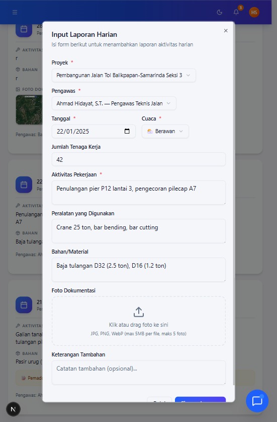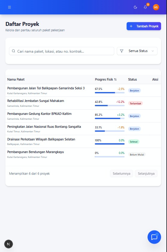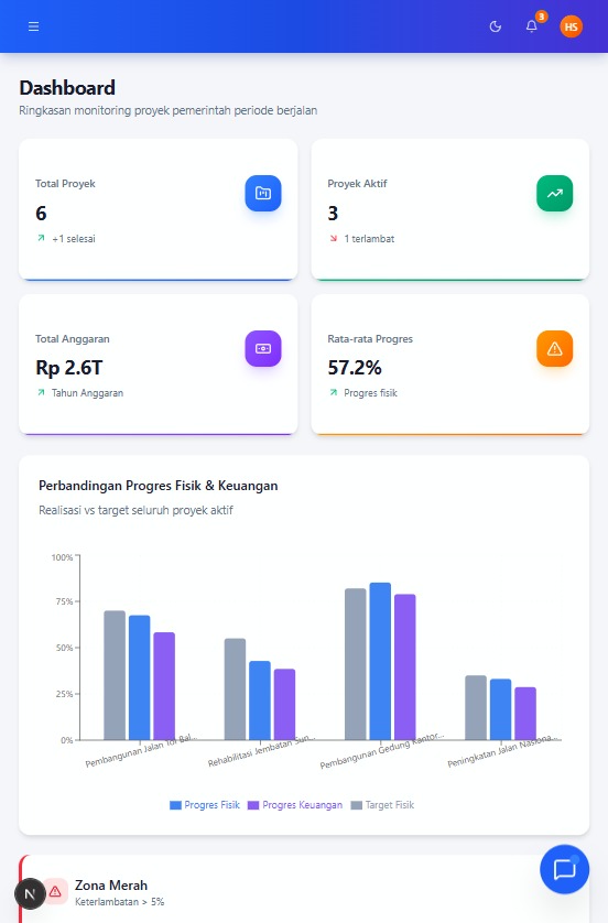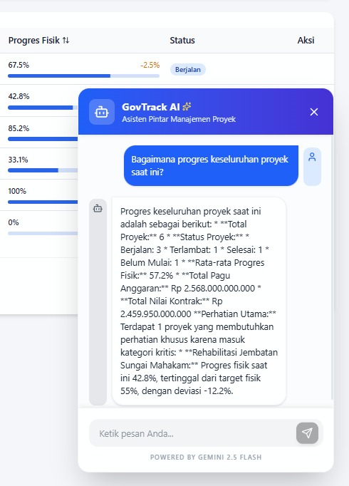 Aplikasi ini dirancang untuk mendigitalisasi pemantauan proyek pemerintah secara transparan. Fokus utamanya adalah memastikan kesesuaian antara rencana (target) dan realisasi di lapangan, baik dari sisi fisik maupun penyerapan anggaran, serta menyediakan audit trail untuk setiap perubahan kontrak (addendum). Integrasi dengan Gemini Ai Model 2.5 Flash membuat mudah untuk memonitoring pekerjaan, dengan hanya chat sudah bisa menjawab secara instan terkait progres pekerjaan.